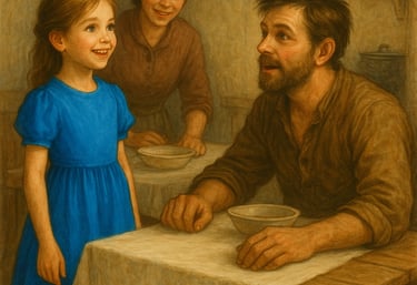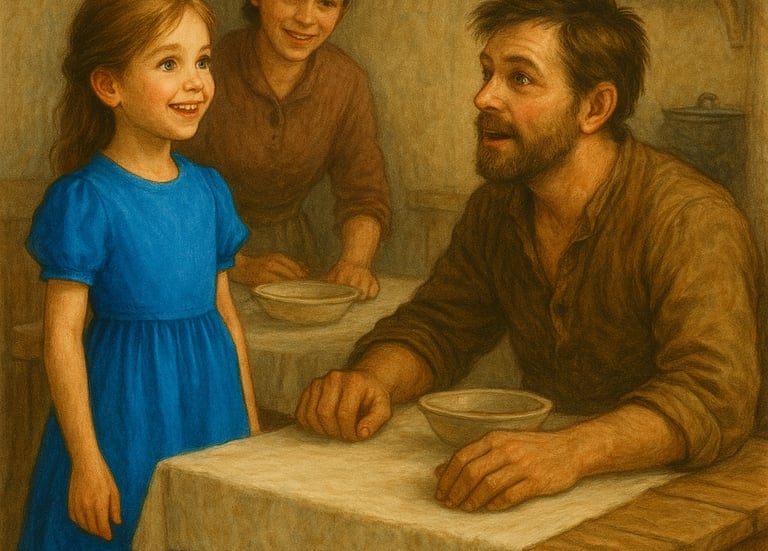 When her father saw her in her new blue dress, he was amazed to find that he had a very pretty little girl. When the family ate supper, he was even more amazed to see a cloth on the kitchen table, The family had never used a table cloth before. “We’re going to begin to be tidier here,” his wife said. “I’m ashamed to be dirty when our daughter is so clean.”
