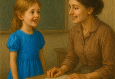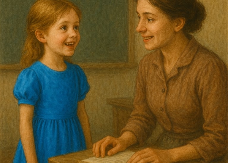 The next morning she came to school in the new blue dress, and she was very clean and tidy. She told her teacher, “My mother couldn’t believe her eyes when she saw me this morning in my new dress. My father wasn’t at home, but he’ll see me at supper tonight.” She was full of excitement.